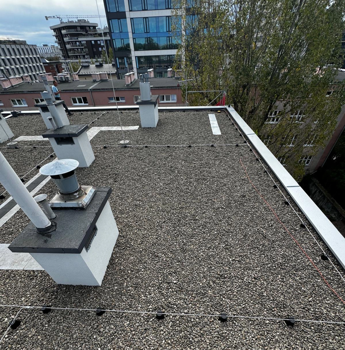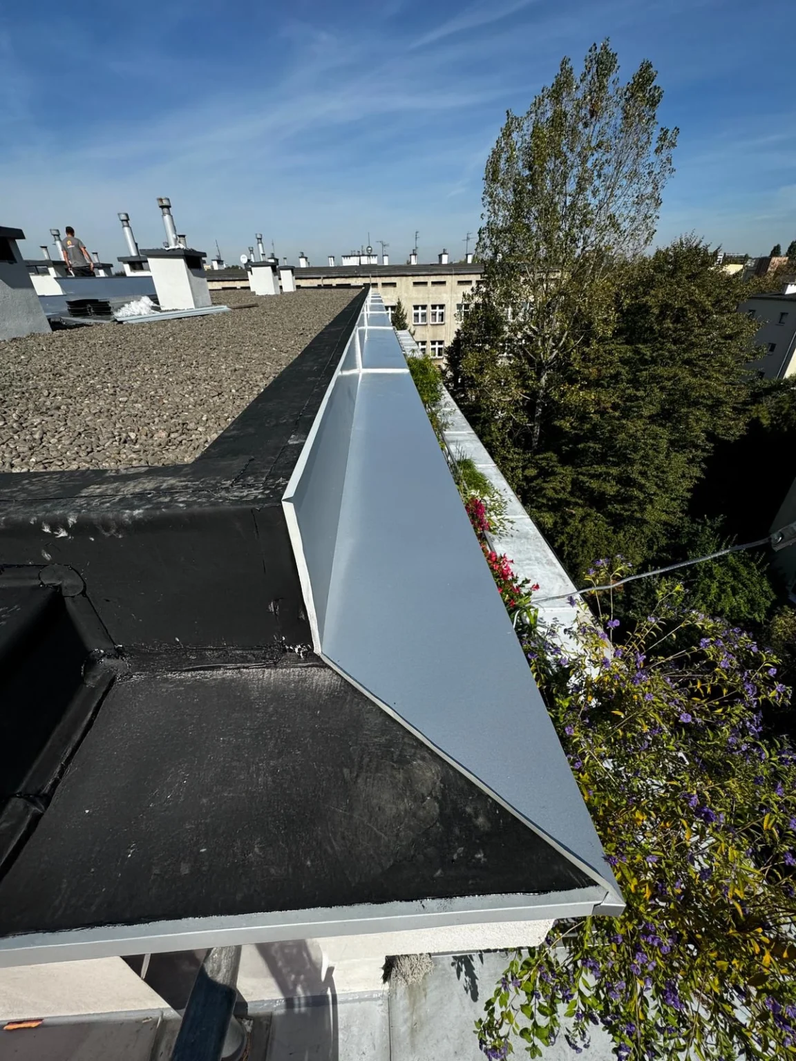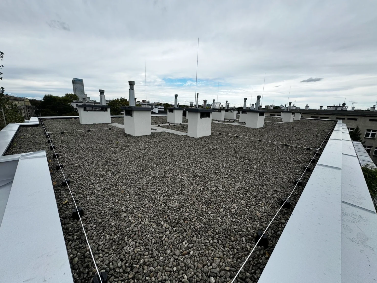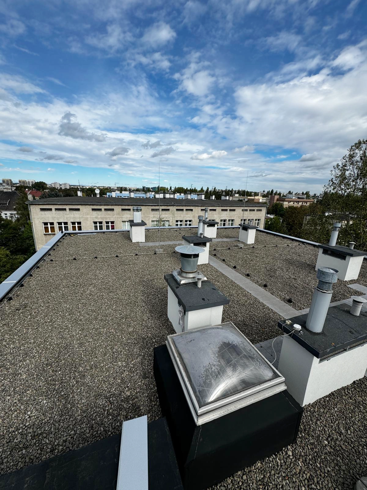 Kompleksowy remont pokrycia dachowego obejmujący technologię EPDM - Resitrix, izolację termiczną, nowe obróbki blacharskie oraz wymianę rur spustowych.