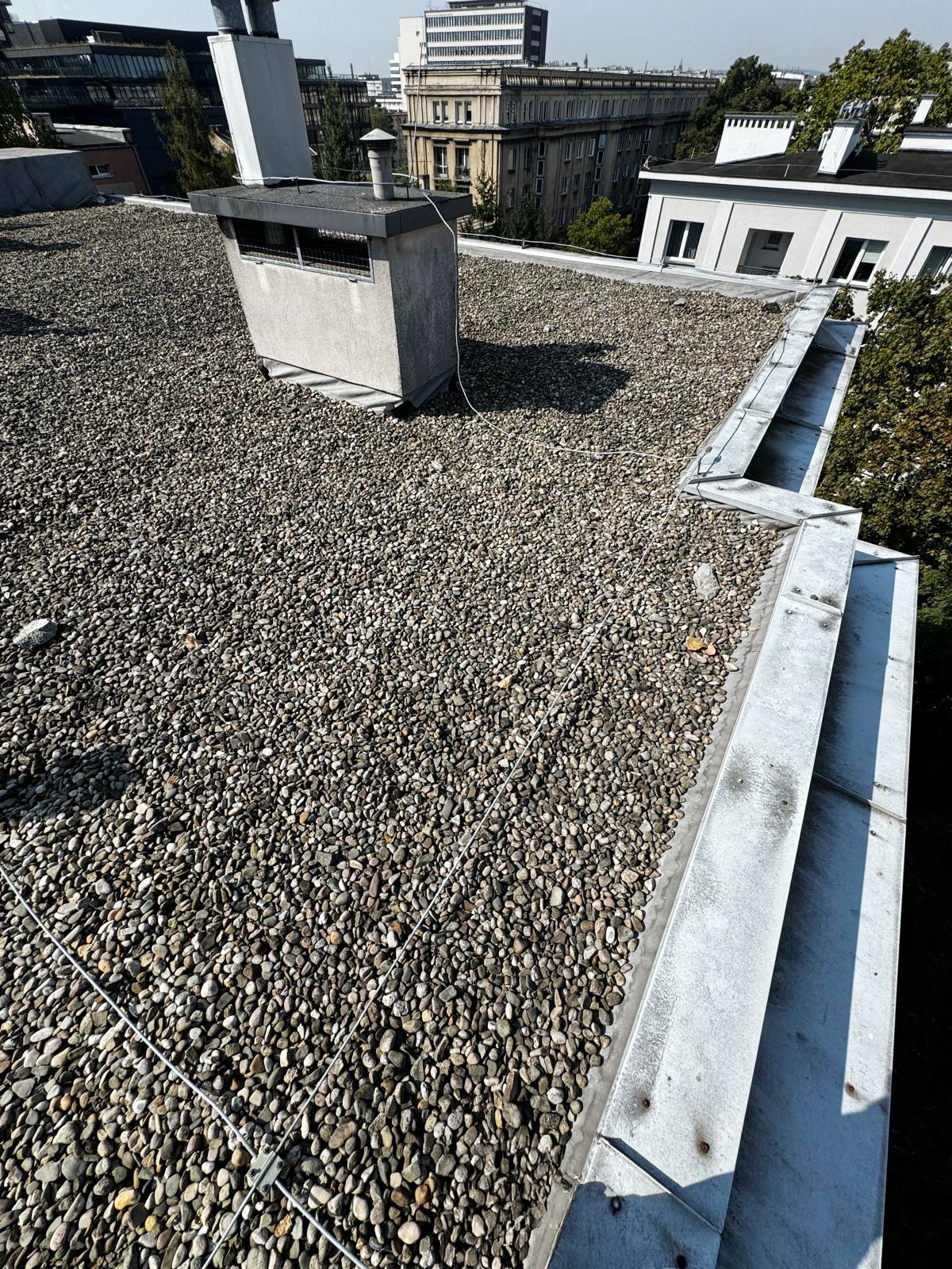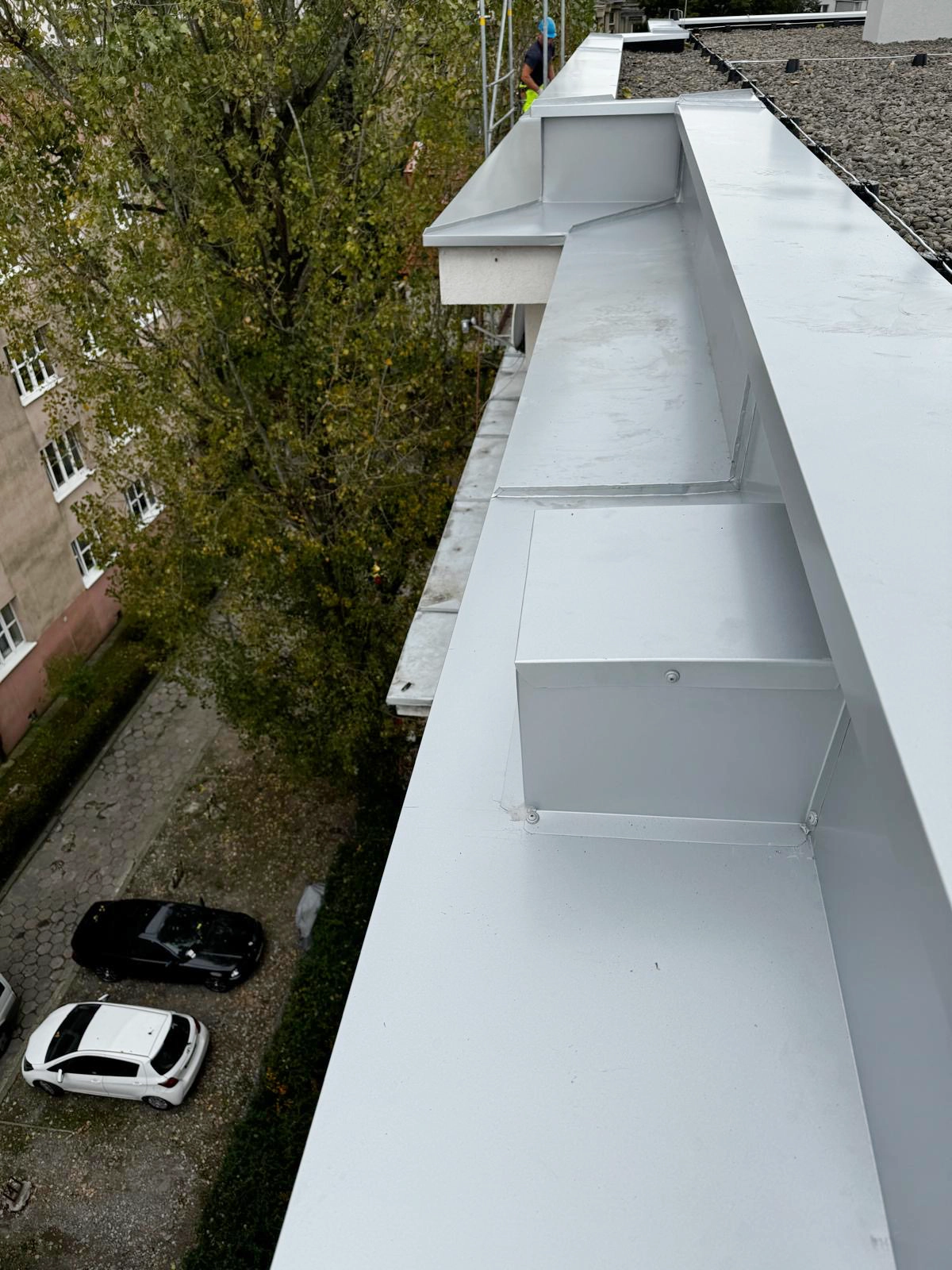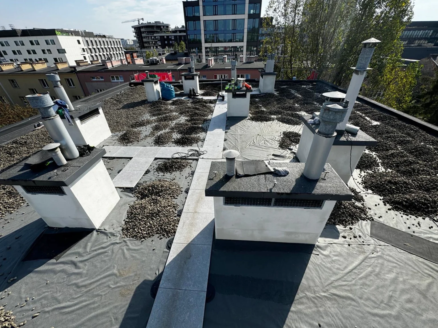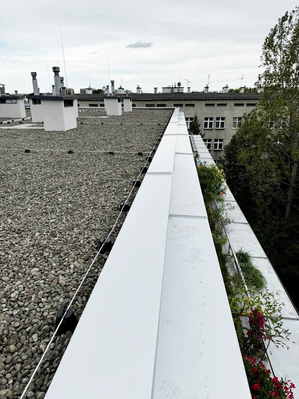 Kompleksowy remont pokrycia dachowego obejmujący technologię EPDM - Resitrix, izolację termiczną, nowe obróbki blacharskie oraz wymianę rur spustowych.