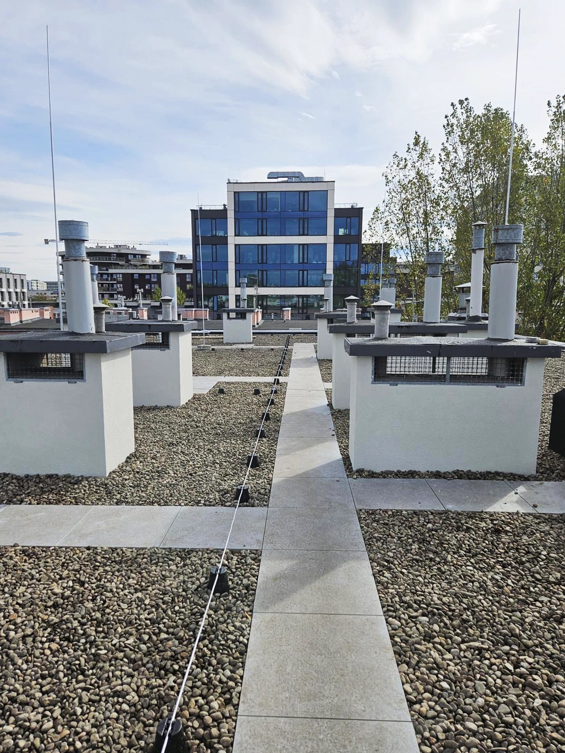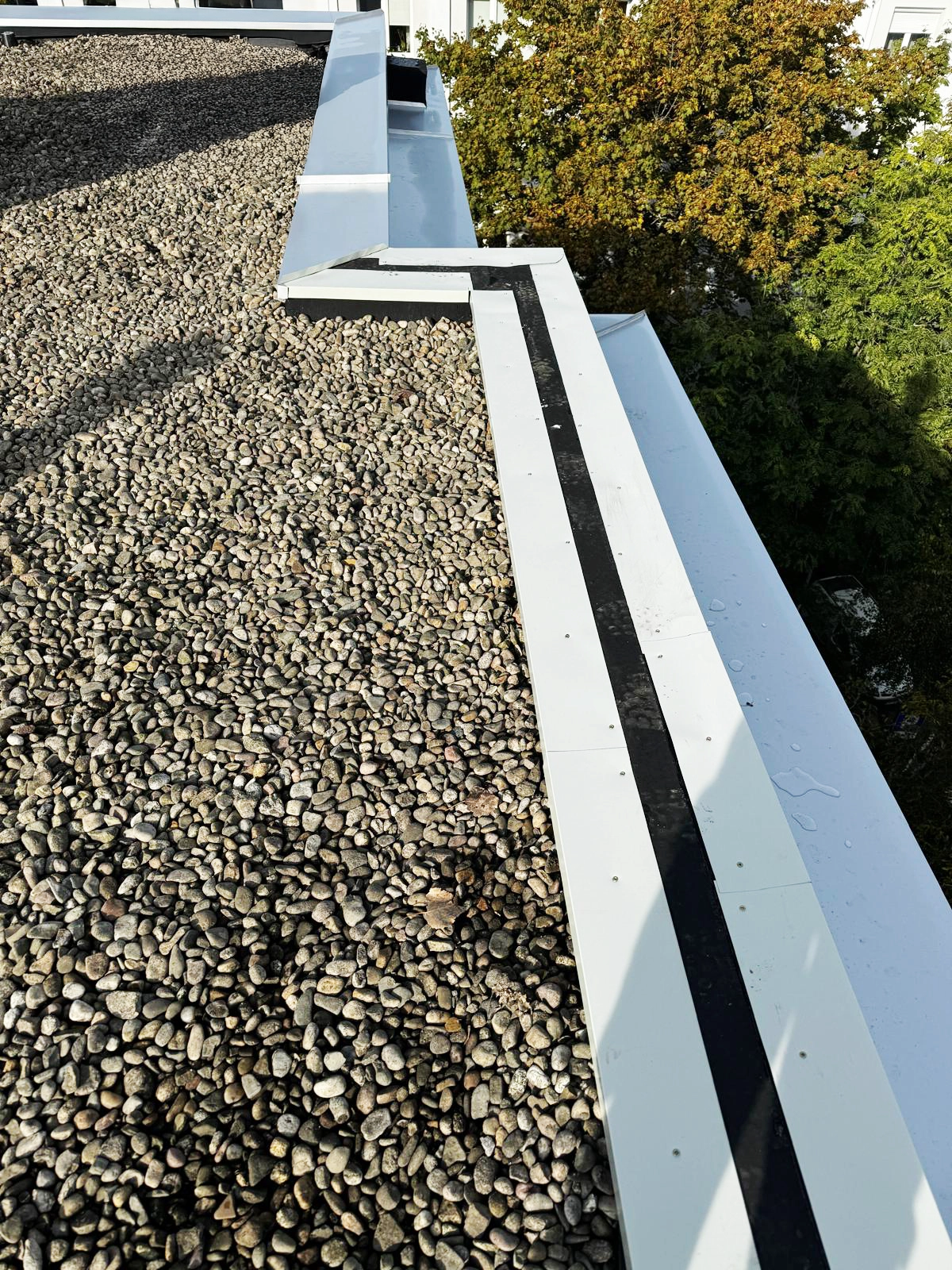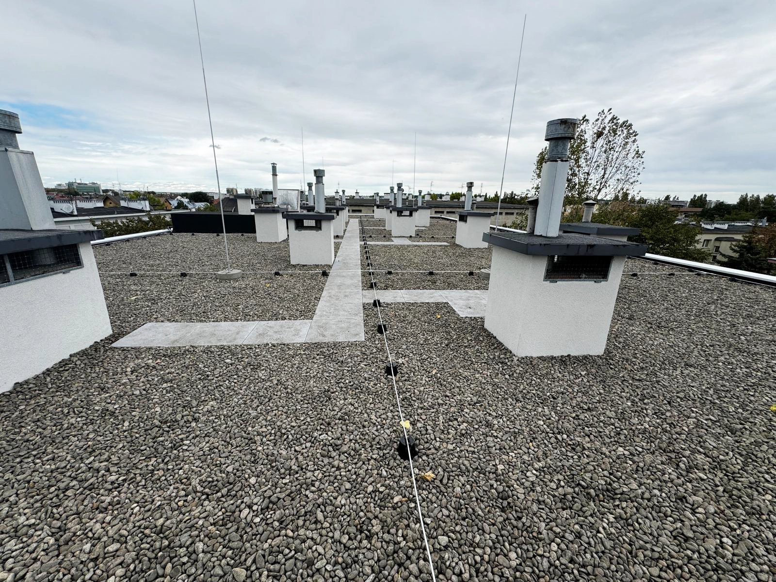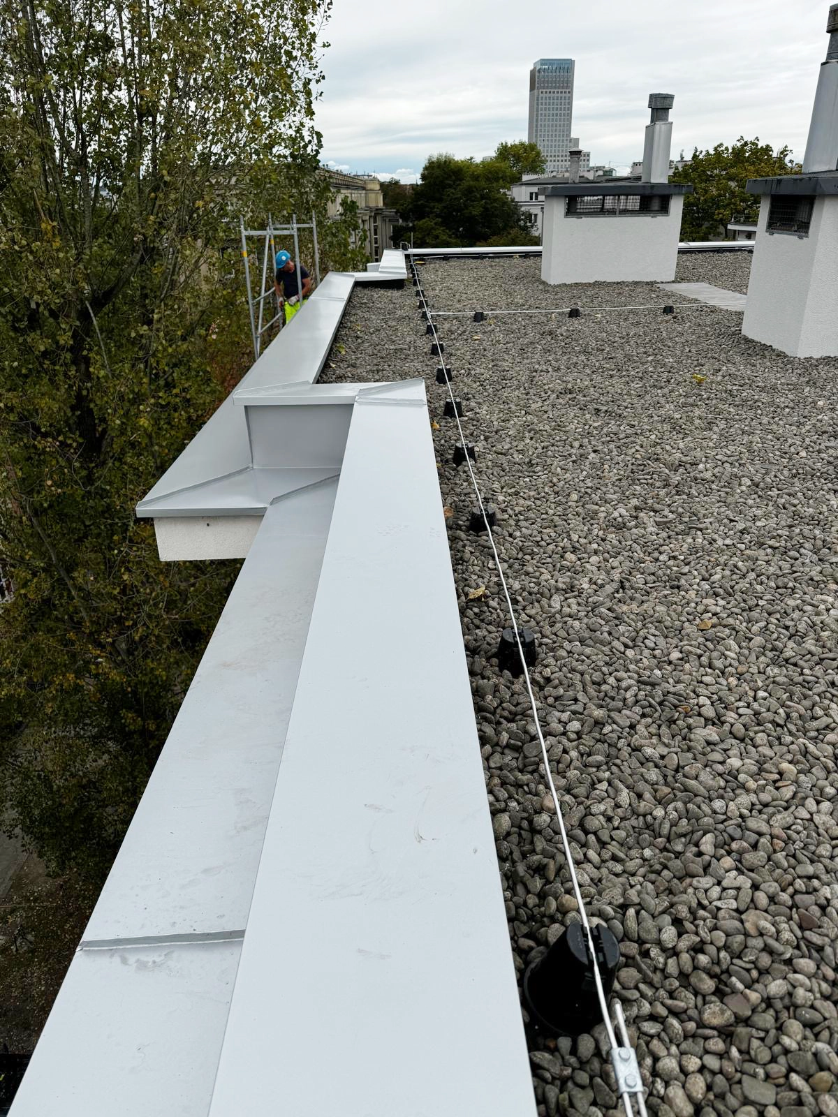 Kompleksowy remont pokrycia dachowego obejmujący technologię EPDM - Resitrix, izolację termiczną, nowe obróbki blacharskie oraz wymianę rur spustowych.